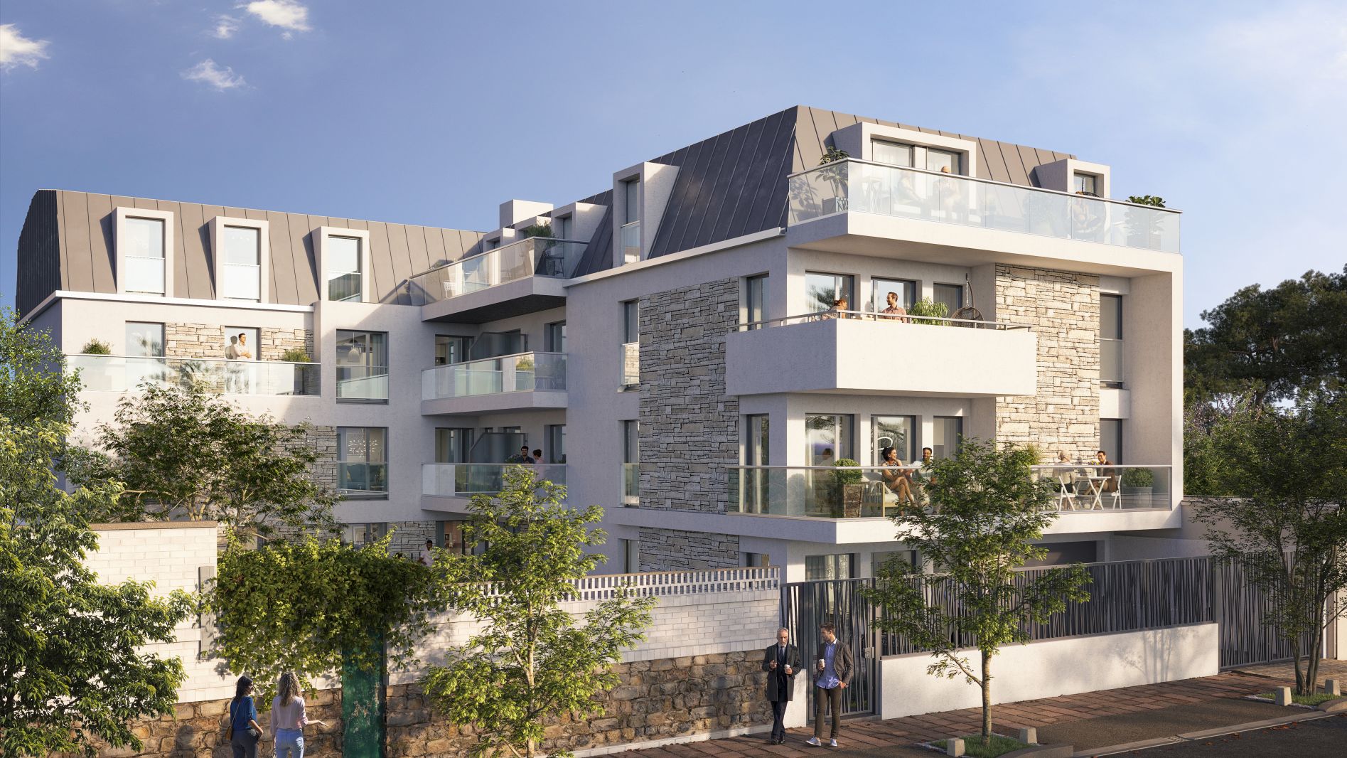 La résidence dévoile une architecture soignée, mêlant parement en pierre grise, enduits clairs et toiture en zinc aux formes arrondies. Son style contemporain s'affirme avec raffinement, not...